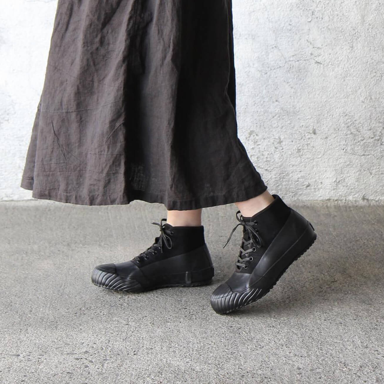 Canvas shoes with a fine rubber sole that extends up the sides by Moonstar. Made of high-quality water-resistant cotton canvas and “vulcanized rubber,” which naturally conforms to the shape of your foot. The surrounding rubber guards against rain, snow, and mud, so you can wear them in “all-weather” conditions.